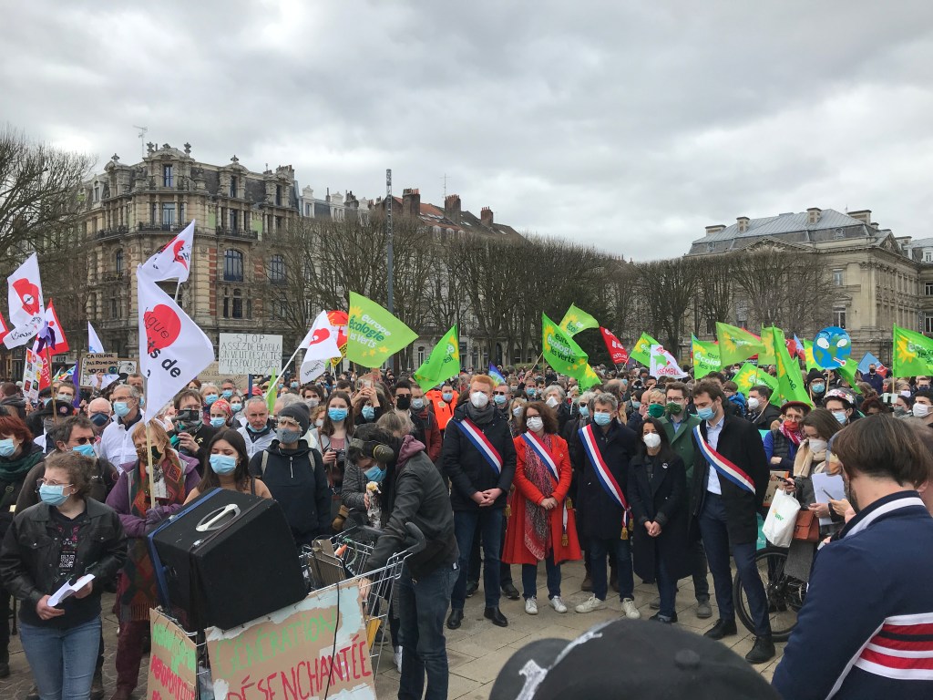 A Lille, le cortège avait été initié par un collectif de citoyens et d’associations (Maison Régionale de l’environnement et des solidarités, Youth for climate, les Ajoncs …), et largement trusté par la liste de gauche qui se présente aux élections régionales. Les députés Adrien Quatennens (La France Insoumise), Fabien Roussel (communiste), Jennifer Temmerman (Libertés et territoires), et bien sur Karima Delli (Europe écologie les verts) ont pris la parole avant le départ du cortège.