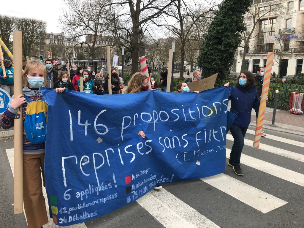 POur symboliser les 146 propositions de la Convention, des tubes en carton issus de d’une friche industrielle et colorés pour l’occasion étaient portés par des manifestants.